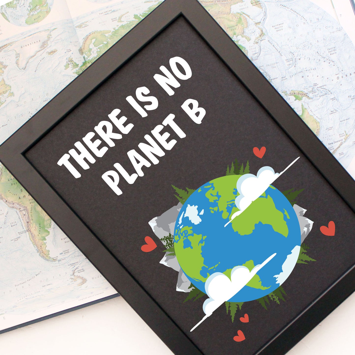 This stylish environmentalist ‘There is No Planet B’ print is such an important reminder that the world needs us, and that we must take care of our planet. It features a minimalist Earth with mountains, trees, clouds, and hearts on a black background.